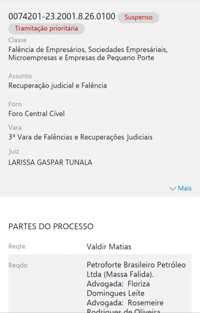 A massa falida da Petroforte acumula uma infinidade de processos trabalhistas, tributários e cíveis. Documentos e publicações oficiais do Tribunal de Justiça de São Paulo (TJSP) mostram que o espólio da empresa continua no centro de disputas que envolvem credores, ex-funcionários e o próprio Estado, todos tentando recuperar parte do prejuízo deixado pelo colapso.