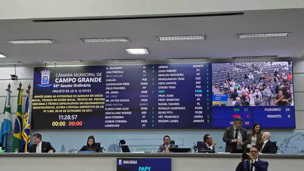 A Câmara Municipal de Campo Grande aprovou, na manhã desta terça-feira (25), por unanimidade (22 votos a 0), o Projeto de Lei n.º 63/2025, encaminhado pelo Executivo, que atualiza dispositivos da Lei n.º 5.903/2017 e estabelece acréscimos ao salário base das categorias de Auxiliar em Saúde Bucal, Técnico em Saúde Bucal, Técnico em Prótese Dentária […]
